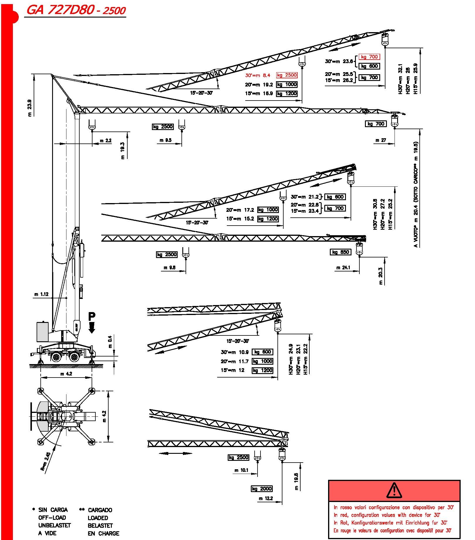 Schnellbaukran GA 727, max. 2.500 Kg, bei 27,00 Meter – 700 Kg.
